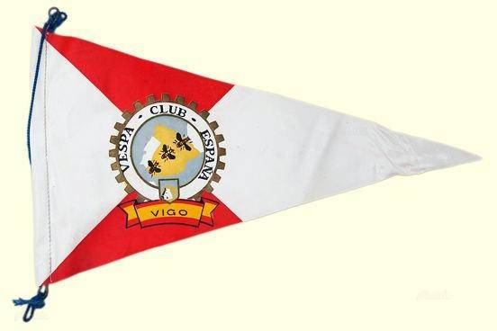Banderín del Vespa Club Vigo de los años 60 donado por Manolo Vespa. Este tipo de piezas adornadas con el emblema de Vespa España, eran personalizadas para los clubes. Los tres elementos intercambiables eran: El fondo del banderín (en este caso con la bandera de Vigo), el blasón (con el castillo y el olivo, símbolos de la ciudad) y el nombre del Club (Vigo, dentro de la enseña española).
