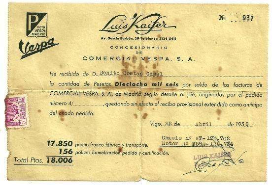 El 22 de Abril de 1959, Benito Costas Casal, hizo efectivo el pago de 18.006 pesetas por la compra de su Vespa en LUIS KAIFER. En un periodo de tres meses, tuvo que hacer diversas gestiones. Aquí rescatamos esos papeles que rezuman humedad.