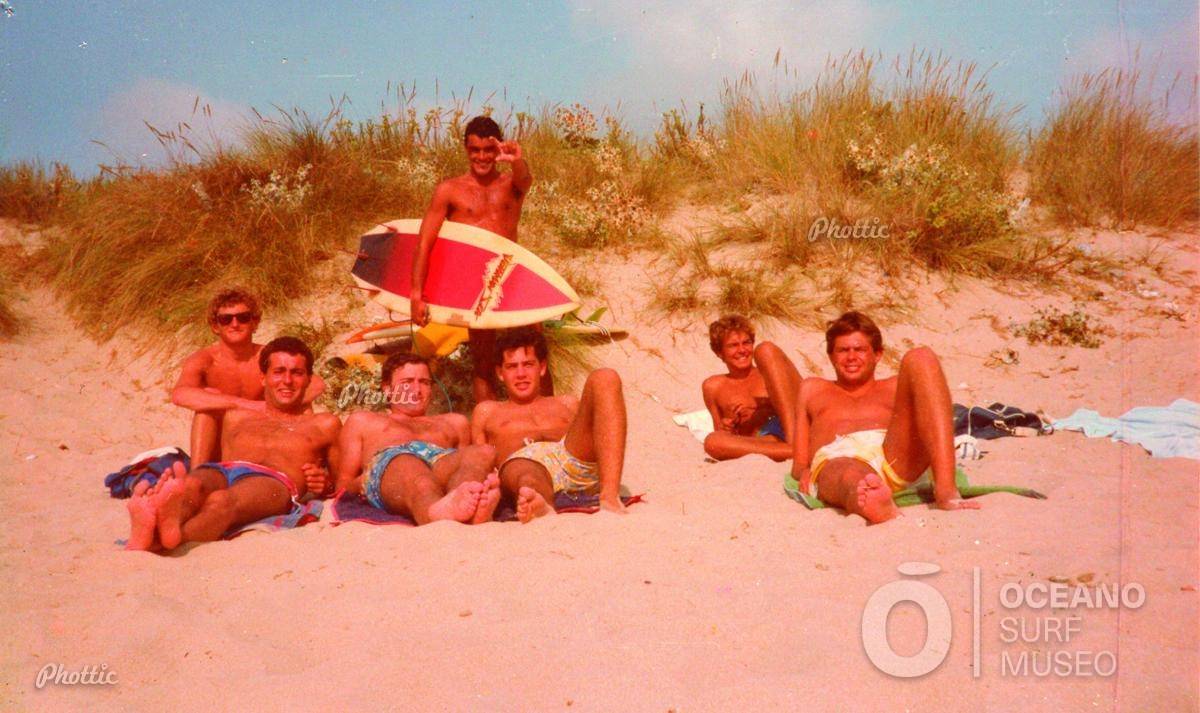 Haciendo un descanso y tomando el sol en la duna de Doniños (Ferrol). De izquierda a derecha: Keko y Fernando “Montalbo”, Javier Goas, Luiziño “Noroeste” Couto, Fernando Antón y Alberto Antón. De pie Alejandro Nores con la Vitamin Sea de Chiri Couto. Detrás de Alejandro Nores la Nat Young que Fernando “Montalbo” compró a unos australianos que pasaron por Doniños.